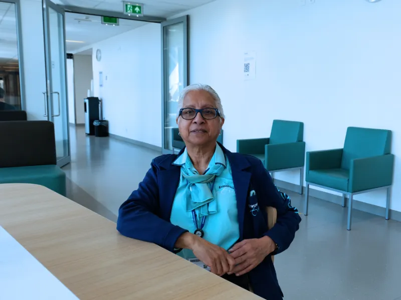 ‘Ik wilde deel uit blijven maken van de maatschappij, iets doen voor de mensen’, vertelt Greet Sahuleka over haar werk als vrijwilliger bij het Erasmus MC. ‘Wat moet je anders doen als gepensioneerde…