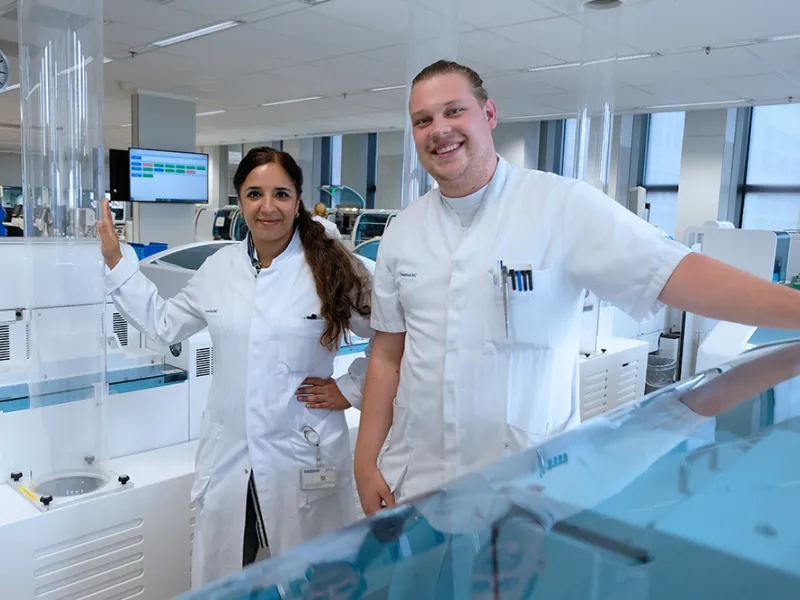 Rens en Naila werken beiden als kernanalist op het Diagnostisch Kernlab. ‘De combinatie tussen techniek en de patiënt maakt het werk zo leuk’ vertelt Rens. Want de hele dag door een microscoop staren…