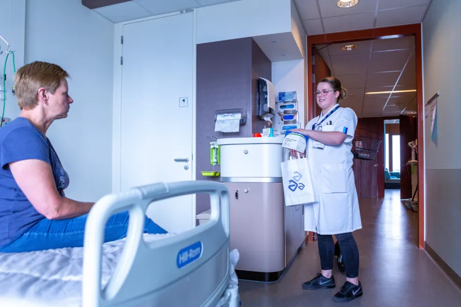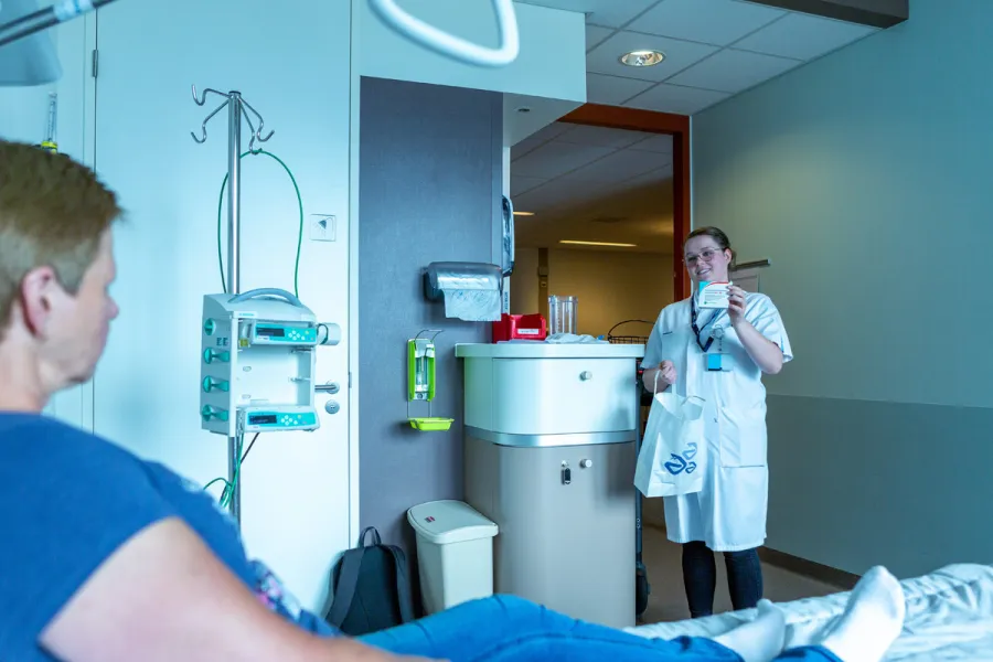 ‘Doordat wij direct op de verpleegafdelingen werken, kunnen we meer tijd nemen voor de patiënt. Het contact is persoonlijker en we kunnen onze patiënten begeleiding bieden bij hun ontslagproces. Dit geeft ook voldoening want ik kan mensen met vragen goed op weg helpen. Daarnaast heb ik zelf veel vrijheid om mijn eigen dag in te delen.’