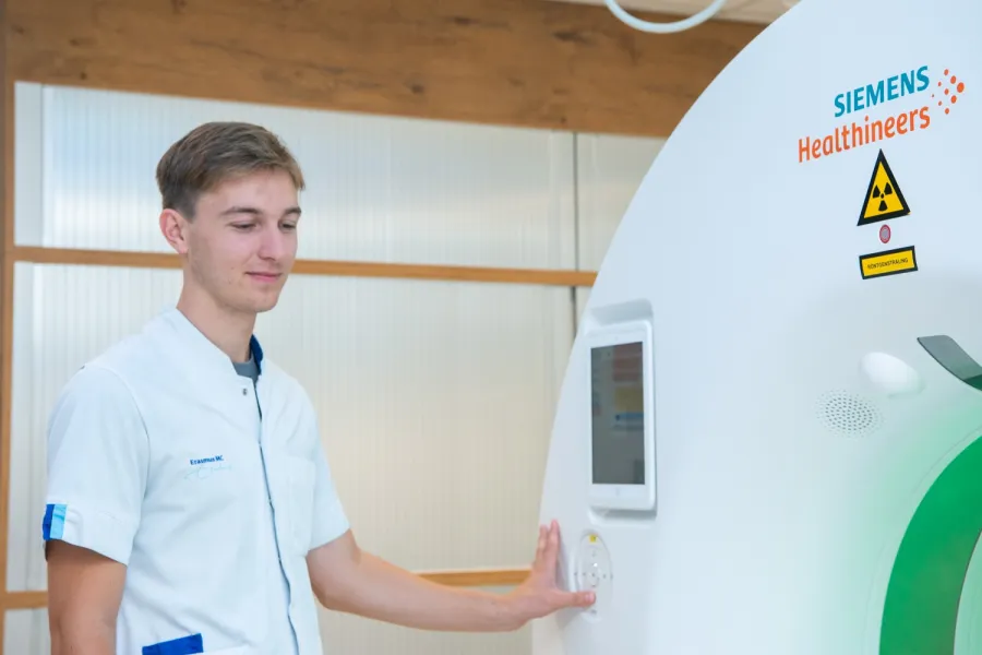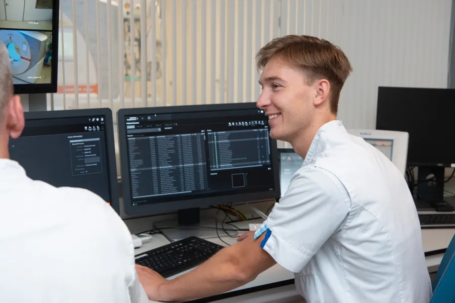 Stuart heeft sinds kort zijn diploma op zak. De afgelopen 4 jaar volgende hij de opleiding MBRT, een werk-leer traject waarbij hij al veel op de werkvloer in het Erasmus MC te vinden was. "Het is fijn om tijdens je opleiding al gelijk werkervaring op te doen. Er is hier veel ruimte voor vragen en mijn collega’s en ik helpen elkaar altijd waar nodig."