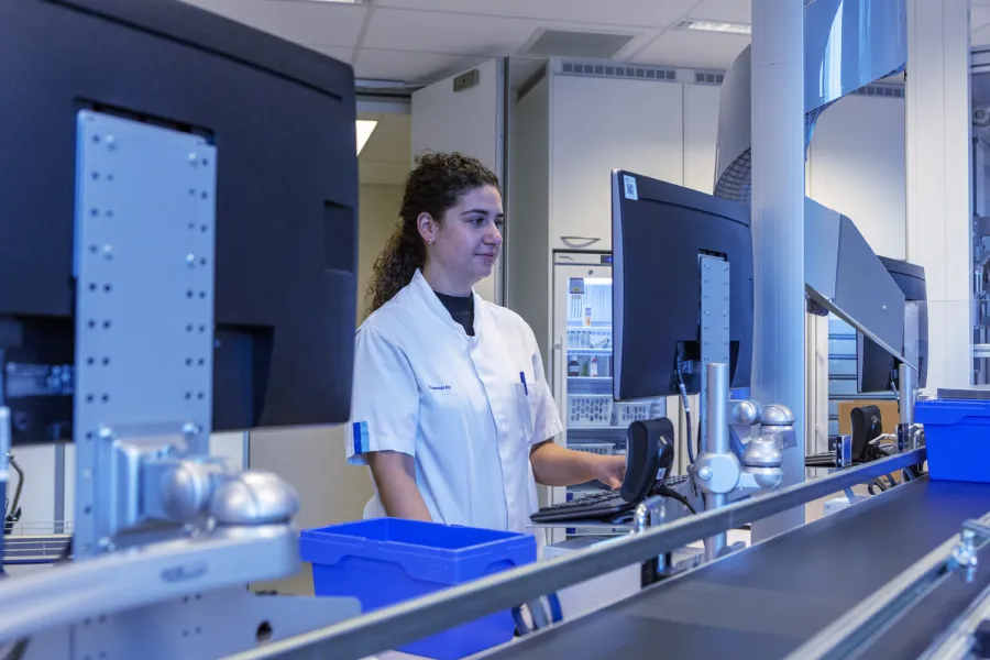 “Je kunt je hier ook specialiseren. Ik stond de eerste maanden vooral aan de balie, maar na een tijdje ben ik me meer gaan richten op de ontslagmedicatie. Ik bereid de ontslagmedicatie voor als patiënten worden ontslagen. Vervolgens breng ik de medicatie zelf langs bij de patiënten op de verpleegafdeling. Het is heel leuk om direct contact te hebben met patiënten en hen goed op weg te kunnen helpen naar huis. En je komt overal."