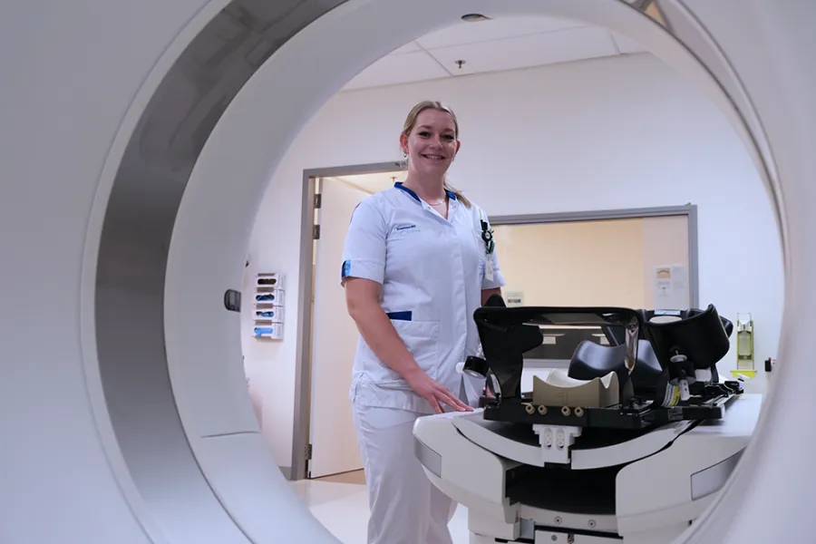 Na het afronden van haar MBRT opleiding koos Esther al gauw voor het Erasmus MC 'Ik wilde altijd al aan de slag in een groot ziekenhuis. Als academisch ziekenhuis is er bij het Erasmus MC veel mogelijk rondom onderzoek. We zijn daarbij ook sterk gespecialiseerd in het bestralen van KNO patiënten. Ik zie bijzondere casussen voorbij komen. Erg uitdagend, dus voor mij was de keuze snel gemaakt.'