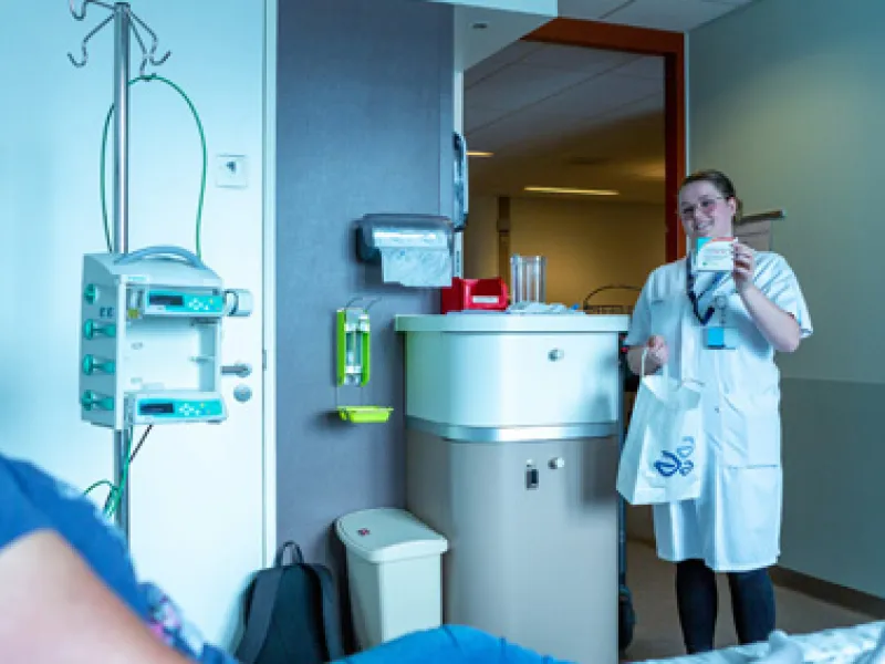 Sherida Bozdag is apothekersassistent bij de poliklinische apotheek van Erasmus MC. Zij stept het hele ziekenhuis door om ontslagmedicatie langs te brengen bij patiënten.