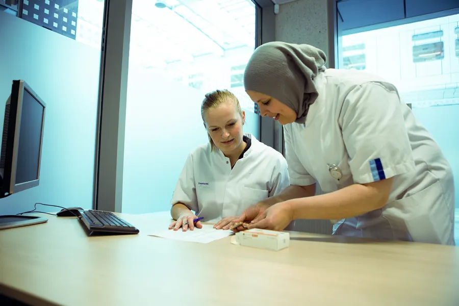 “Dat Erasmus MC een academisch ziekenhuis is, merk je als apotheker zeker. Vanwege de complexe ziektebeelden is de patiëntenpopulatie heel leerzaam. In onze Poliklinische Apotheek zien we bijvoorbeeld patiënten na een lever- of niertransplantatie. Deze patiënten krijgen heel veel geneesmiddelen om afstoting te voorkomen. Wij bekijken of deze geneesmiddelen kunnen in combinatie met andere medicatie die de patiënt gebruikt en controleren of de medicatie passend is na een lever- of niertransplantatie. Ook geven we voorlichting aan de patiënt om ervoor te zorgen dat zij de medicatie blijven innemen”
