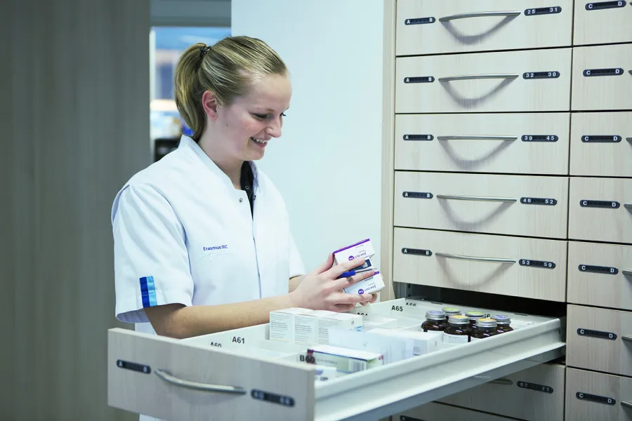“In Erasmus MC vinden tal van onderzoeken en studies plaats. Het komt regelmatig voor dat we geneesmiddelen uit het buitenland importeren omdat een medisch specialist dit wil voorschrijven aan zijn patiënt er geen geregistreerd alternatief in Nederland beschikbaar is. We werken dan nauw samen met de specialist om dit geneesmiddel te verkrijgen. Ik verzorg de onderbouwing naar de Inspectie waarvoor dit geneesmiddel noodzakelijk is."