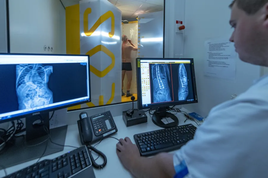 EOS: Hoe gebruiken we deze nieuwe techniek in het Sophia Kinderziekenhuis? Wervelkolomchirurg Dr. van West en MBB'er Erik vertellen over een unieke scolioseopname.